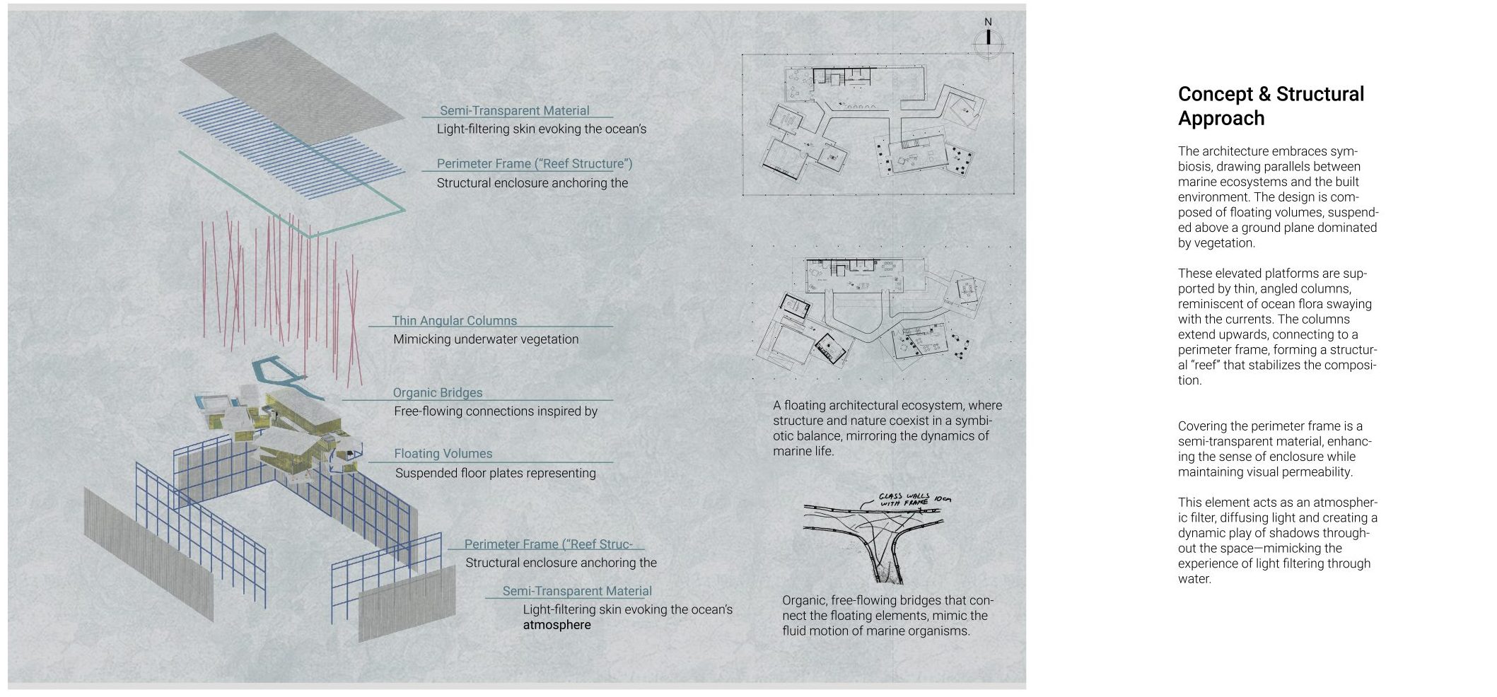 ecosystems. The design concept takes inspiration from the ocean’s layered ecosystem, with the built structure metaphorically representing a
