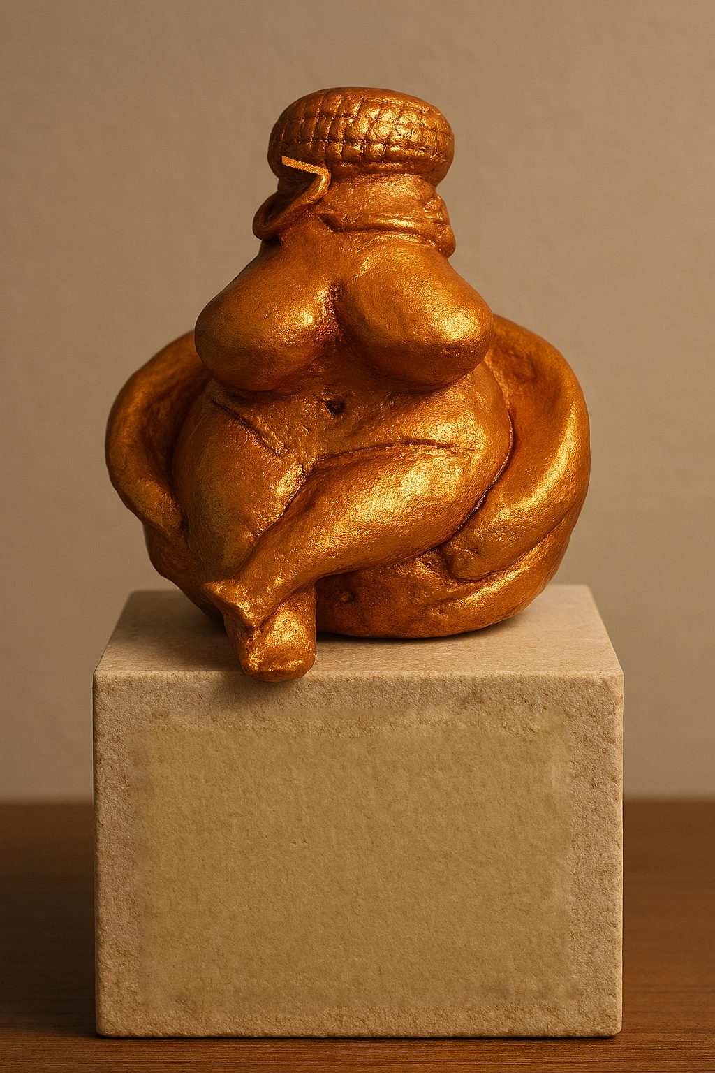 This piece reimagines the Venus of Willendorf with a modern, irreverent twist. Seated in her quiet repose, she holds a cigarette with casual defiance. An icon of fertility taking five. She celebrates rest, autonomy, and the unapologetic presence of the feminine body. Stripped of labels and context, she sits atop a simple pedestal, inviting reflection on identity.